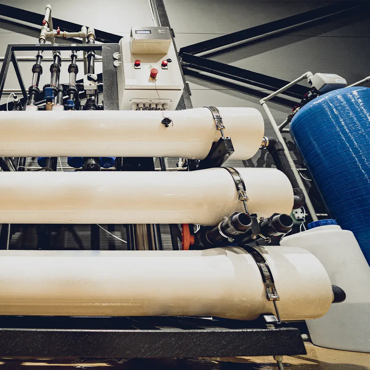 We use Stainless Steel (S.S.) piping for high-pressure lines to ensure durability and GRP vessels for membrane protection.
